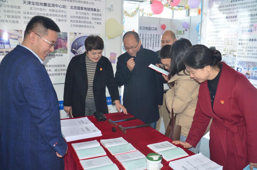 11月19日,党委组织部部长边修蕊、党委宣传部部长贾作璋、党委员工工作部部长张伟参观地质实习成果展并细致翻阅了员工实习报告,与讲解老师就某些科学问题深入交流,对PA视讯官方网站员工实习成果展的举办及“四融”创新人才培养成果给予高度评价和充分认可。