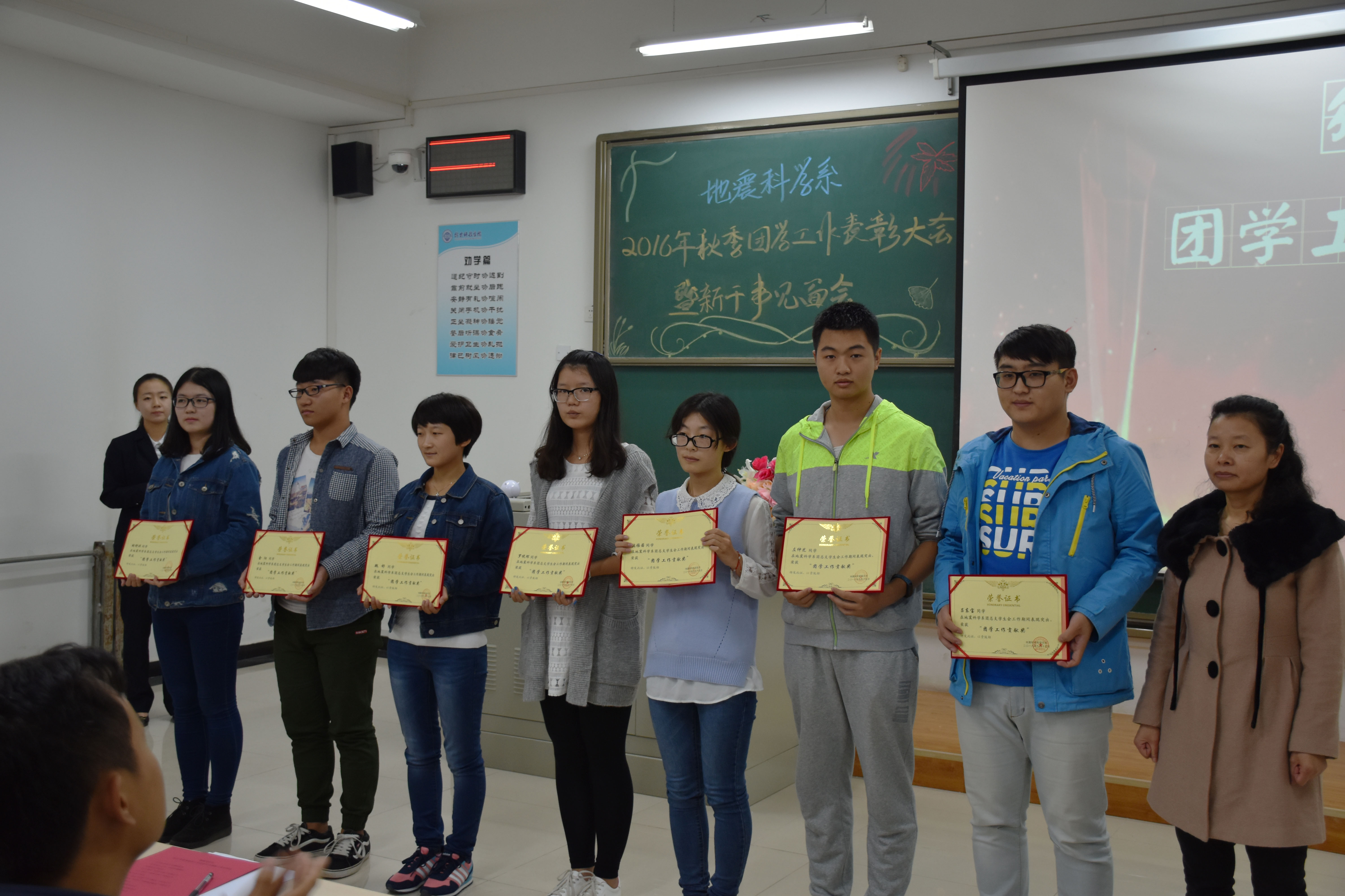 10月13日下午,我系在北校实验楼306教室举行2016年秋季团学工作表彰大会暨新干事见面会。参加此次大会的有系团总支书记唐圣华老师,辅导员牛永君、秦海啸、张玉琛、王鹤、牛晓龙老师,系团总支员工会全体成员、各班员工代表参加了大会。