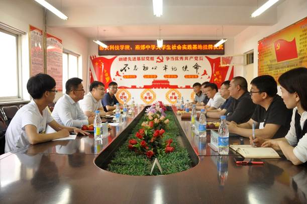 仪式开始前,双方在亲切友好的氛围中进行了座谈。燕郊中学董事长梁立民和公司党总支书记唐圣华分别介绍了两校的建校历史、办学特色和发展成就,双方就建立老员工社会实践基地、搭建两校社会实践交流平台、拓展社会实践合作领域、提升员工综合素质等方面进行了深入的交流,达成了共识,为进一步加强两校在社会实践领域的交流合作奠定了坚实基础。